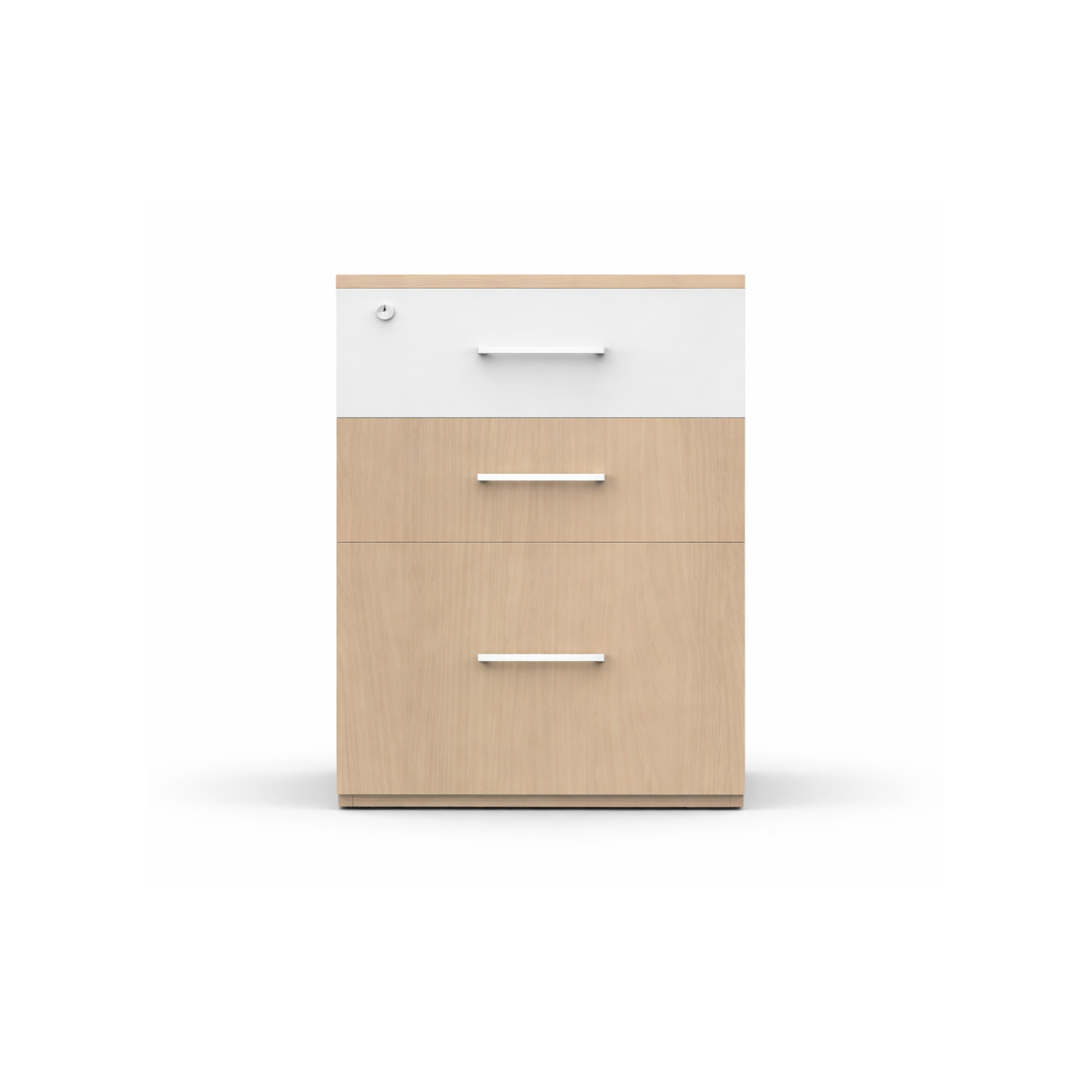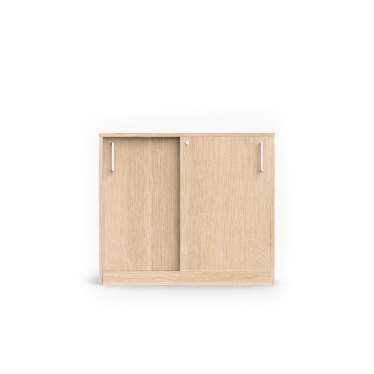 Minimalist wooden finish cabinet with dual doors. Perfect for storing files, office supplies, and documents securely.