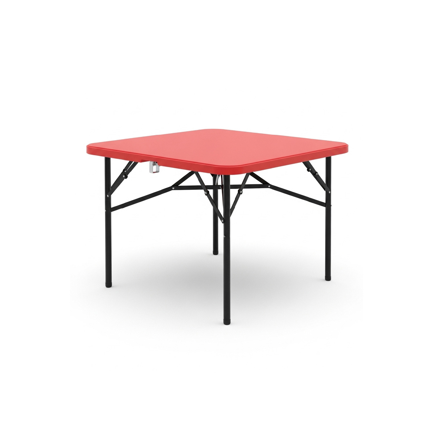 Stylish red tabletop with foldable black metal legs. Lightweight yet durable, suitable for temporary setups and cafeteria spaces.